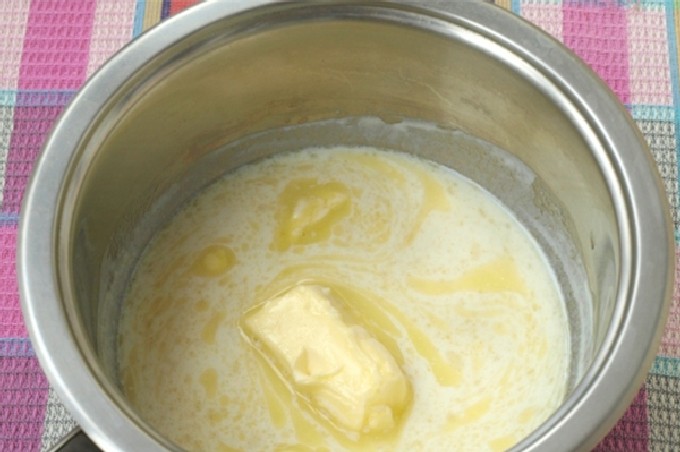 - Giet melk in een kleine steelpan, voeg boter toe die in kleine stukjes is gesneden, onder voortdurend roeren, breng deze massa aan de kook. Giet het hete, maar niet kokende room-melkmengsel bij het deeg en meng meteen tot een gladde massa.