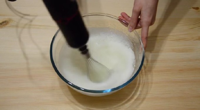 - We nemen een perfect droge container, we zullen er eiwitten in doen. Scheid de eiwitten van de dooiers. Klop de eiwitten afzonderlijk met een mixer, de massa moet meerdere keren toenemen, dicht en luchtig zijn.