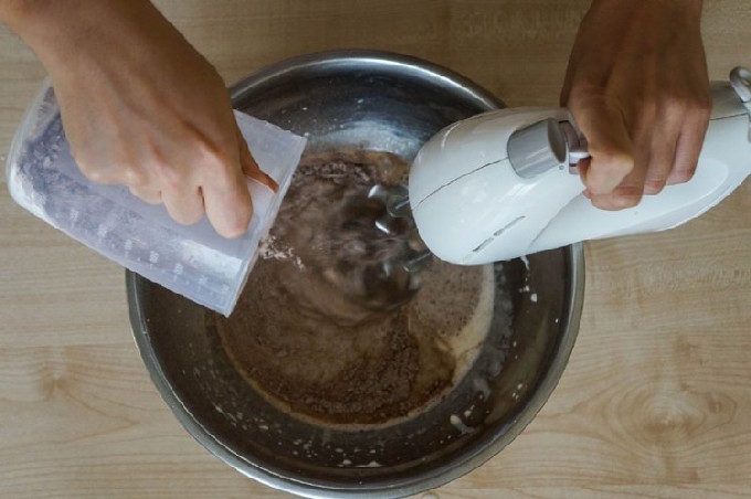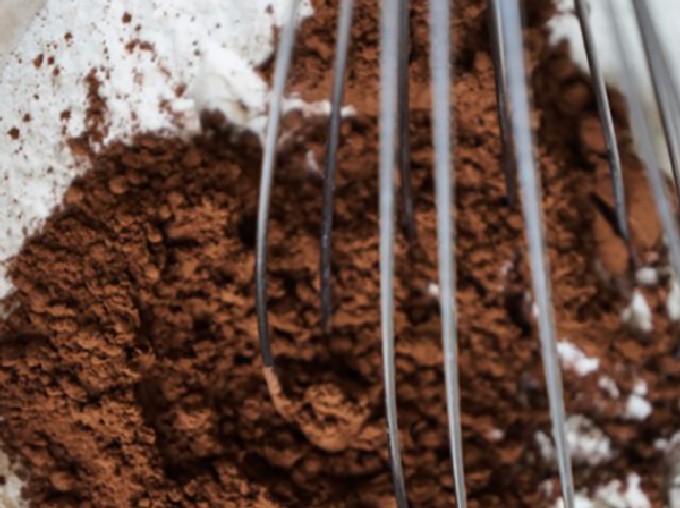 - Giet bloem, cacao, frisdrank, bakpoeder in een aparte container, meng.