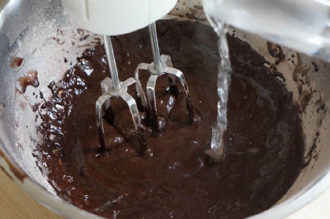 - We koken water en gieten het onmiddellijk in het deeg, roeren, dus de bloem begint te brouwen.