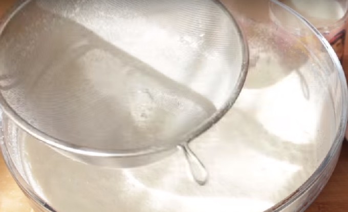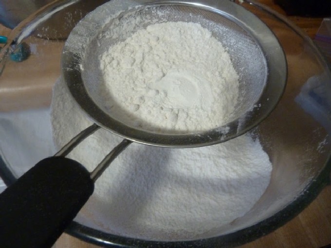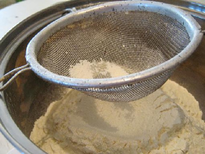 - Om het deeg met zuurstof te vullen, moet het meel door een zeef worden gezeefd.