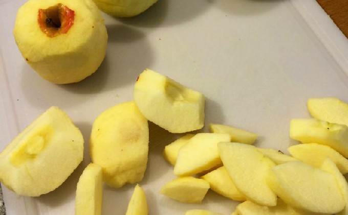 - Schil de appels, verwijder de twijgen en het klokhuis, snijd ze in schijfjes van ongeveer gelijke dikte, doe in een kom en bestrooi met kaneel.