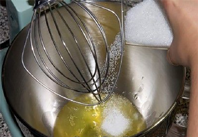 - Klop de eieren met een mixer tot de massa verdubbelt, voeg geleidelijk suiker toe en blijf kloppen tot een gladde massa, de suiker moet volledig oplossen.