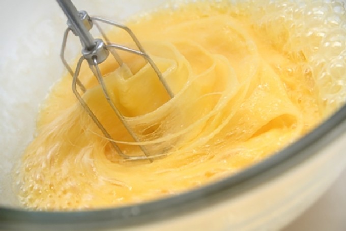 - Klop eerst de eieren met een mixer, het is niet nodig om het eiwit van de dooiers te scheiden. Klop tot het volume verdubbelt, voeg dan een beetje suiker toe en blijf kloppen, de massa moet zeer aanzienlijk lichter worden.