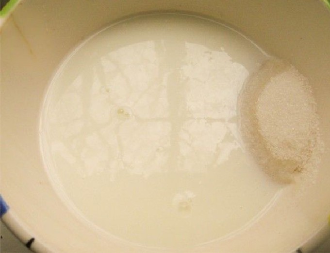 - Giet de melk in een kom, voeg suiker toe en roer tot de suiker volledig is opgelost.
