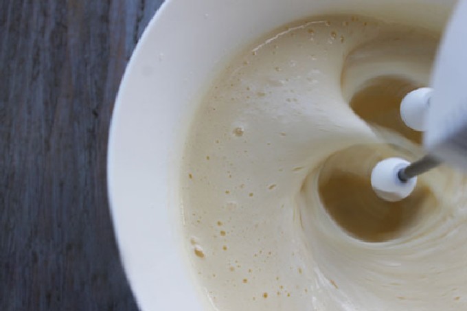 - Giet melk en plantaardige olie in de eiermassa, meng.