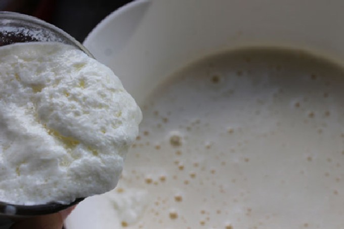 - Giet melk in een kleine steelpan, voeg boter toe die in kleine stukjes is gesneden, onder voortdurend roeren, breng deze massa aan de kook. Giet het hete, maar niet kokende room-melkmengsel bij het deeg en meng meteen tot een gladde massa.