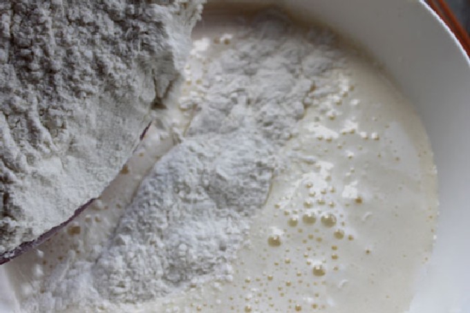 - Zeef de bloem door een zeef, dit kan je direct in een bak met melk doen. Meng voorzichtig, voeg soda geblust met azijn toe. Als de klontjes moeilijk te breken zijn, kun je een mixer gebruiken en het deeg glad kloppen.