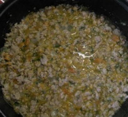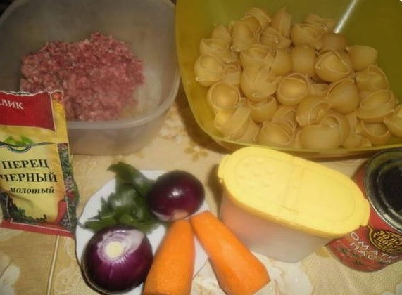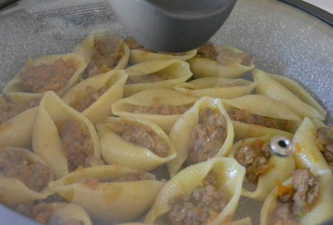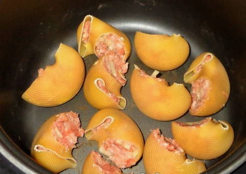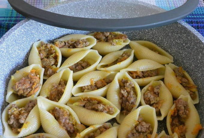 - Bak uien met wortelen in een pan, voeg dan gehakt toe en laat een beetje sudderen. Voeg kruiden naar smaak toe. We doen de vulling in de schelpen en doen ze in een koekenpan met een beetje water en plantaardige olie.