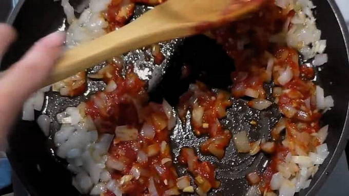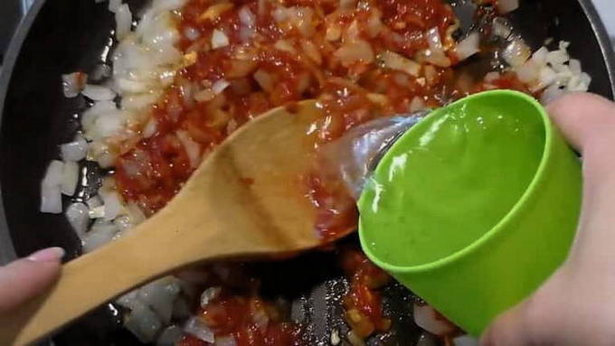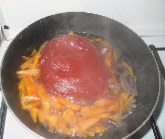 - Uien met wortel een paar minuten in een beetje water sudderen. Voeg vervolgens de tomatenpuree toe en roer.