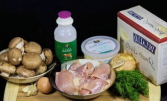 We bereiden alle benodigde producten voor. We wassen de kip en snijden hem in kleine stukjes, schillen en hakken de ui en champignons.
