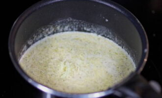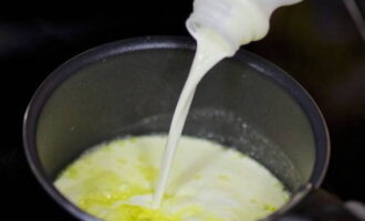 - Laten we beginnen met de saus. Smelt hiervoor boter in een koekenpan, voeg bloem toe en brouw het mengsel, af en toe roerend. Voeg geleidelijk de melk toe, terwijl je blijft roeren, zodat de saus homogeen is. Nootmuskaat toevoegen.