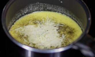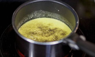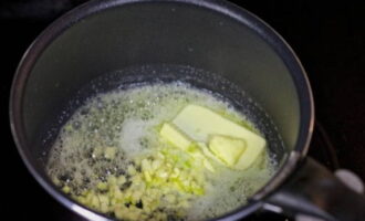Laten we beginnen met de saus. Doe hiervoor boter en fijngehakte knoflook in een pan die op laag vuur is verwarmd.