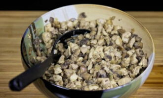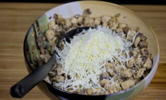 Voeg de rest van de geraspte kaas toe aan de kip met champignons.