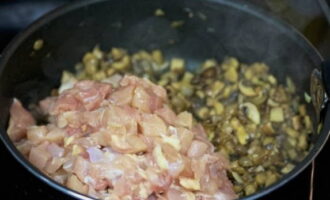 Voeg vervolgens de kip toe aan de pan.