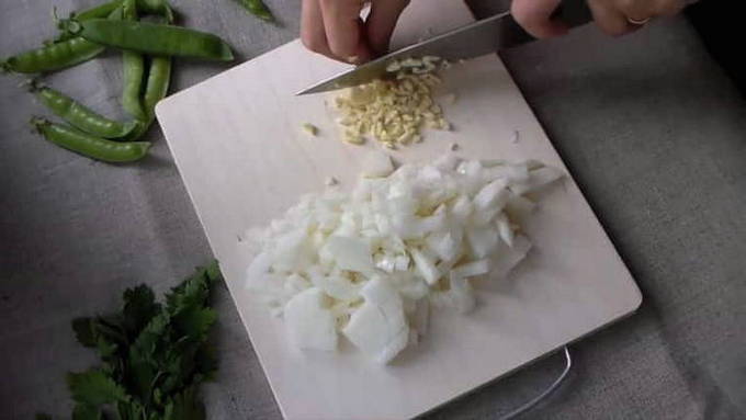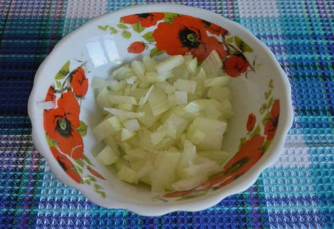 - We schillen de uien, spoelen ze af met water en snijden ze in kleine stukjes.