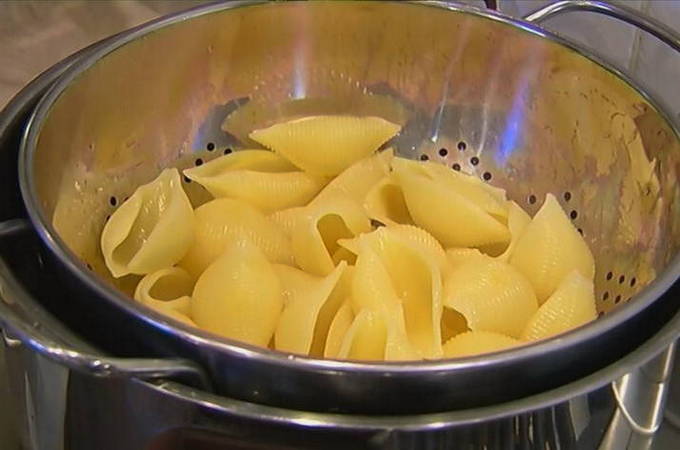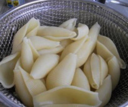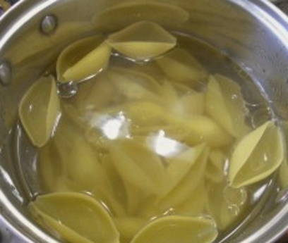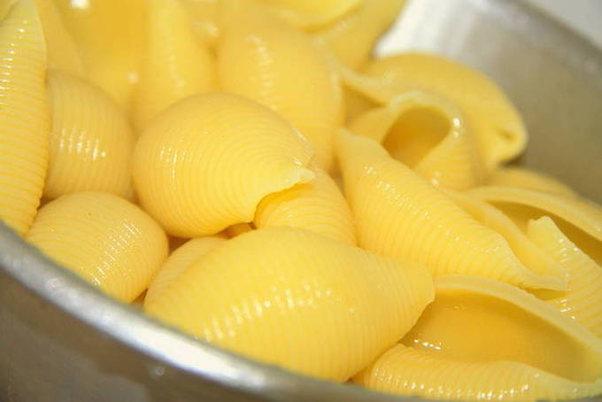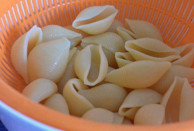 - Kook de schelpen 5 minuten in gezouten water, giet het water af en spoel de pasta af.
