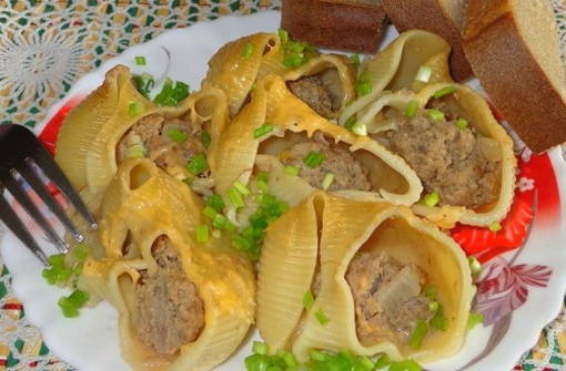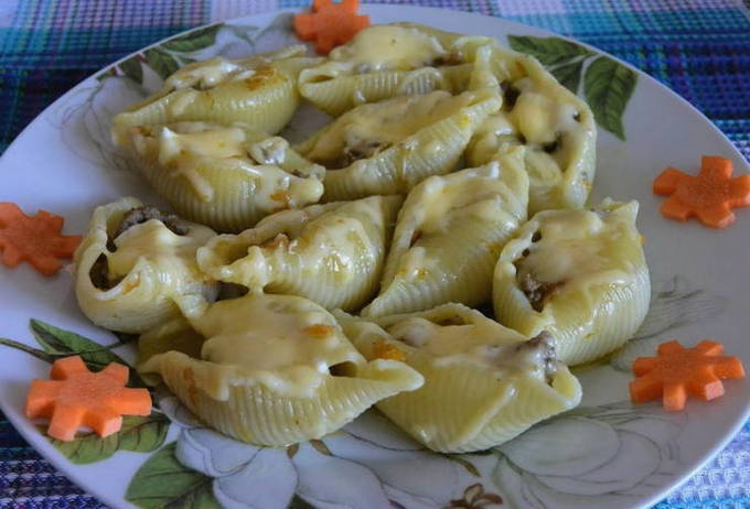 Een heerlijk recept voor schelpen met gehakt gebakken in een romige saus. De pasta blijkt zeer mals, maar tegelijkertijd zeer bevredigend te zijn, en het is heel gemakkelijk om het te koken.