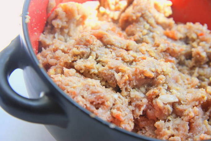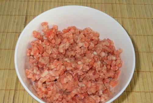 - We wassen de varkenshaas onder koud water, snijden in stukjes en malen met een vleesmolen.