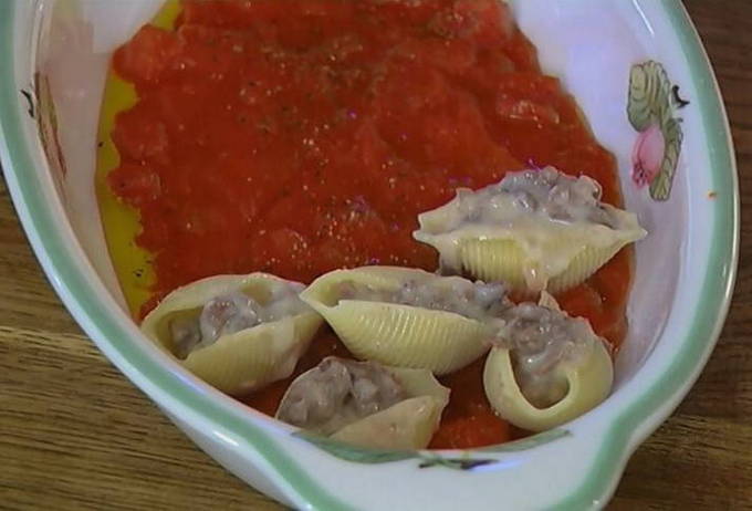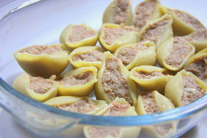 Hoe heerlijk is het om schelpen met gehakt en kaas in de oven te bakken?