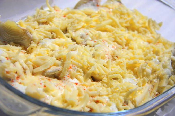 - Bestrooi hete schelpen met kaas en serveer. Eet smakelijk!