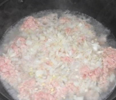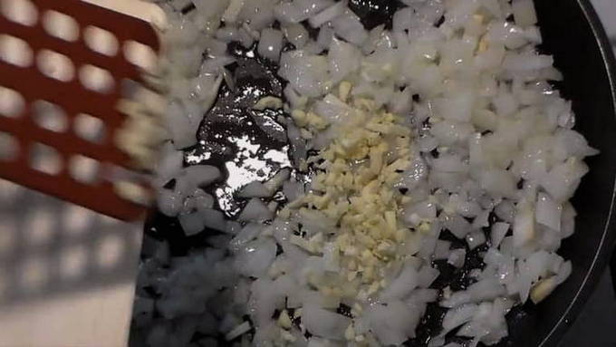- Meng gesnipperde ui met knoflook met gehakt.