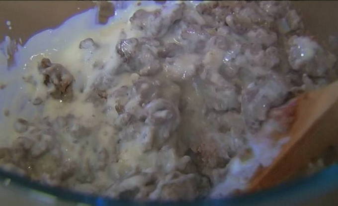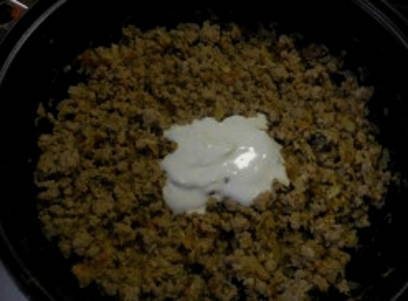 - Voeg een eetlepel zure room toe aan het gehakt, meng alles goed.