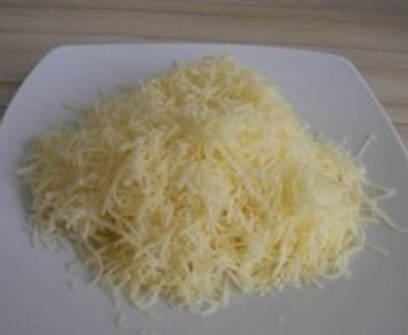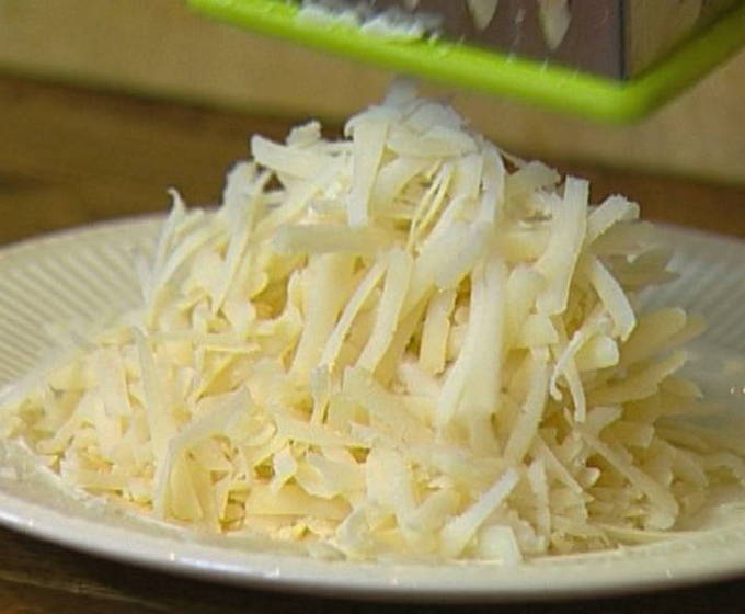 - We wrijven de kaas op een grove rasp en bestrooien met schelpen.