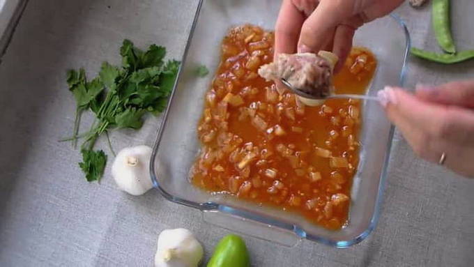 - Voeg zure room, suiker, suneli-hop, basilicum, koriander, zout en een beetje plantaardige olie toe aan de saus en laat 4 minuten sudderen.