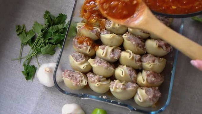 - Stapsgewijs recept voor het maken van schelpen met gehakt in zure room