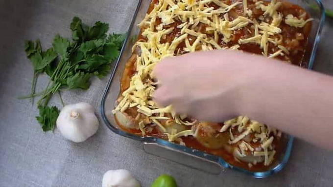 - Verdun de rest van de saus met water en giet in de vorm. Bestrooi met kaas en bak 15 minuten in de oven op 180 graden. Eet smakelijk!