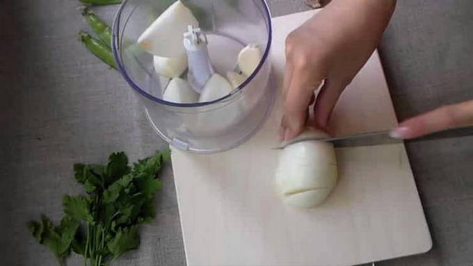 - Voeg indien nodig gesnipperde ui en knoflook toe aan het gehakt. We hakken ook walnoten, pureren de tomaat en kneden het gehakt erdoor samen met peper en zout.
