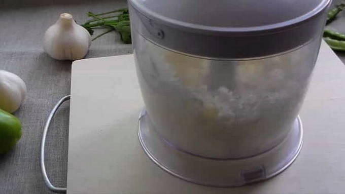 - Doe 2 teentjes knoflook en 1 ui in een blenderkom.