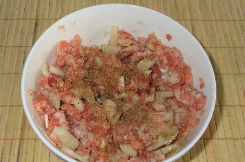 - Zout het gehakt, voeg gemalen koriander toe en roer goed.