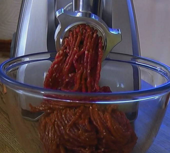 - We halen het vlees door een vleesmolen.