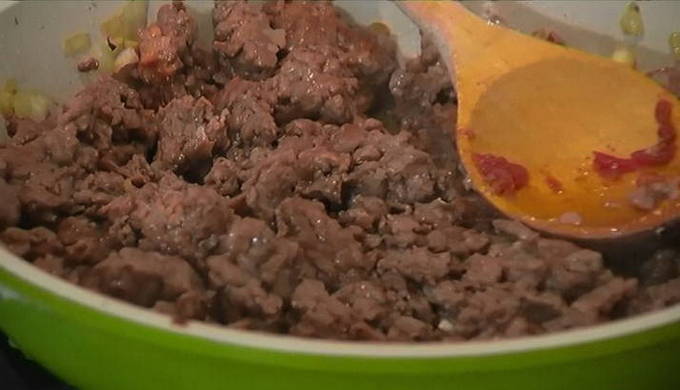 - Voeg gehakt en knoflook toe aan de ui. Zout, peper en meng alles goed. Bak het gehakt gaar.