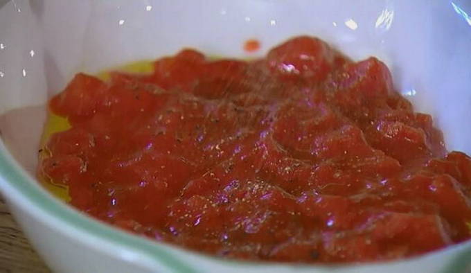 - Leg de tomaten in een ovenschaal, peper en zout en besprenkel met olijfolie.