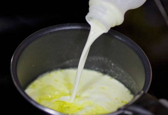 - Laten we beginnen met de saus. Smelt hiervoor boter in een koekenpan, voeg bloem toe en brouw het mengsel, af en toe roerend. Voeg geleidelijk de melk toe, terwijl je blijft roeren, zodat de saus homogeen is. Nootmuskaat toevoegen.