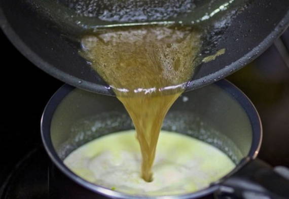 Schenk olie uit de pan bij de saus.