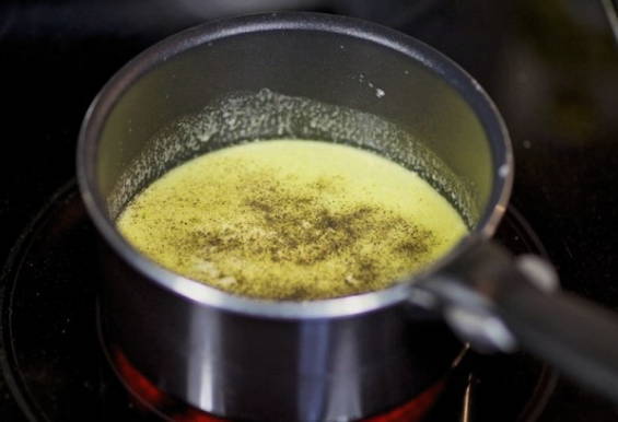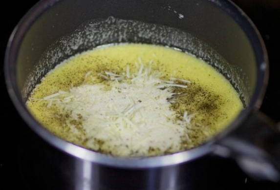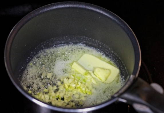 Laten we beginnen met de saus. Doe hiervoor boter en fijngehakte knoflook in een pan die op laag vuur is verwarmd.