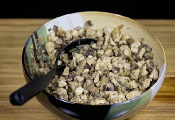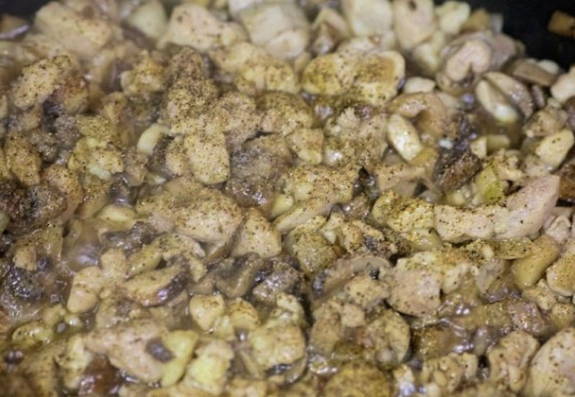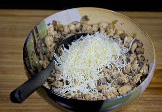 Voeg de rest van de geraspte kaas toe aan de kip met champignons.