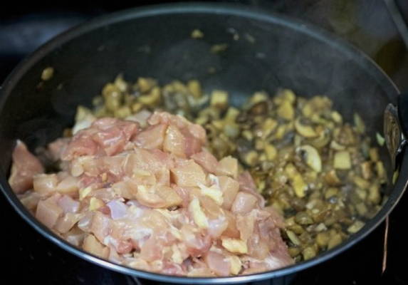 We bereiden alle benodigde producten voor. We wassen de kip en snijden hem in kleine stukjes, schillen en hakken de ui en champignons.