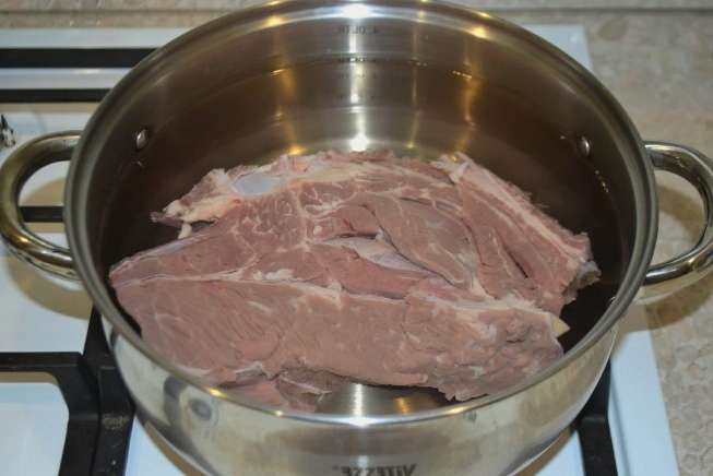 - Vul het vlees met water. Voeg zout toe en zet de pan 1 uur op het vuur.