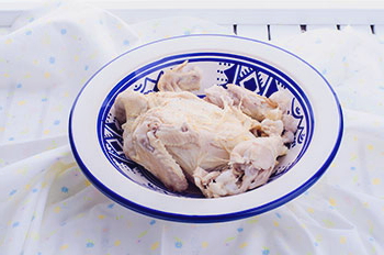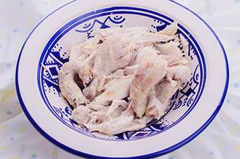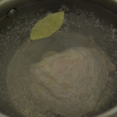 - Kook de kipfilet in water met zout, kruiden en laurier.