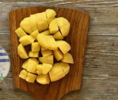 - Laten we beginnen met het voorbereiden van alle ingrediënten. Schil de aardappelen, spoel ze af en snijd ze in middelgrote blokjes.