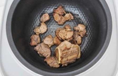 - Bedek de multicookerkom met plantaardige olie. We schakelen een modus in die geschikt is om te frituren met een open deksel. Verdeel het gehakte rundvlees en kook tot het bloost.