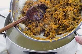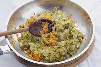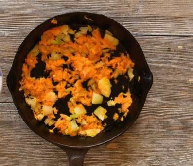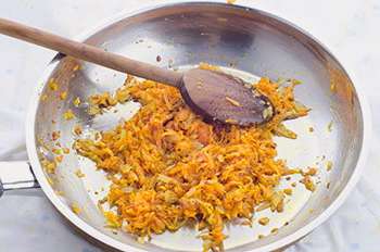 - Verwarm de pan met groente en boter. Bak hier 3-5 minuten geraspte wortelen en gesnipperde uien.