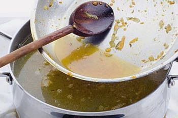 - Schenk de bouillon over de pan, deze doen we ook weer bij de soep.