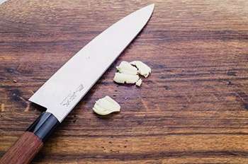 - Maak de knoflookteentjes schoon en hak ze fijn met een mes.