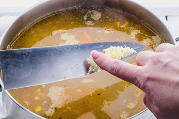 - We sturen de knoflook naar de soep voor een nog helderder aroma en halen na een minuut de pan van het fornuis.